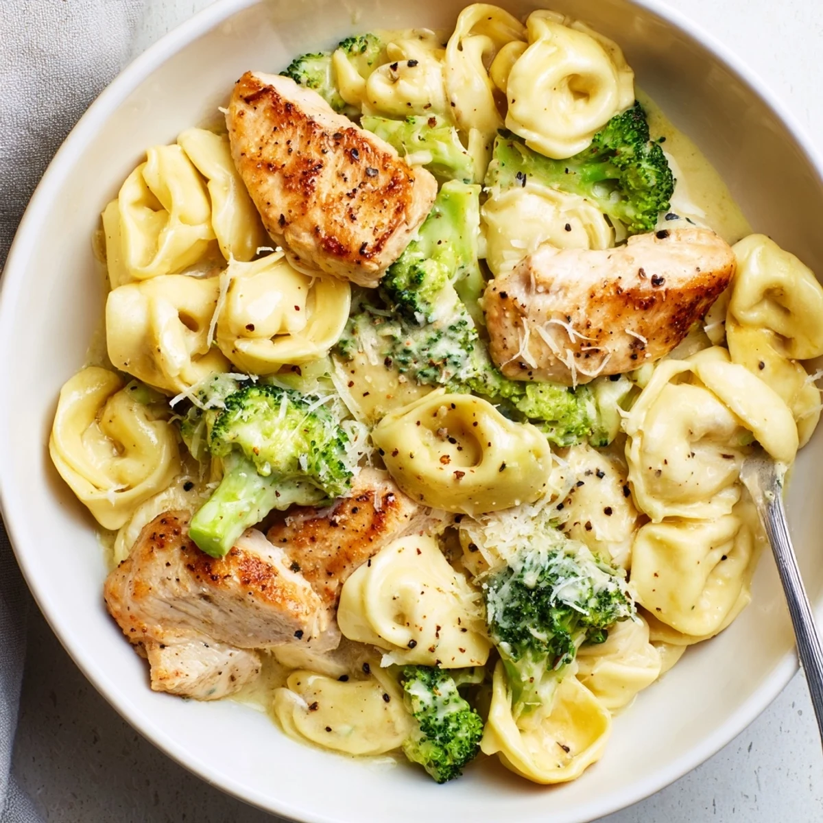 This creamy garlic Parmesan tortellini combines seared bite-sized chicken with tender cheese tortellini and crisp broccoli florets tossed in a smooth, cheesy cream sauce. Cook tortellini with broccoli, brown the chicken, then sauté garlic in butter before adding cream and Parmesan. Finish by folding everything together and seasoning to taste; garnish with extra Parmesan and parsley.