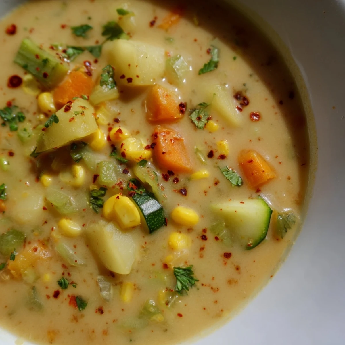 This hearty vegetable soup combines tender potatoes, sweet corn, and fresh zucchini in a rich, creamy broth. The chunky texture comes from partially blending the vegetables, creating the perfect balance of smooth and substantial. Ready in just 45 minutes, this nourishing bowl is ideal for weeknight dinners or meal prep. The smoked paprika adds a subtle warmth, while fresh thyme provides aromatic depth that ties all the garden vegetables together beautifully.