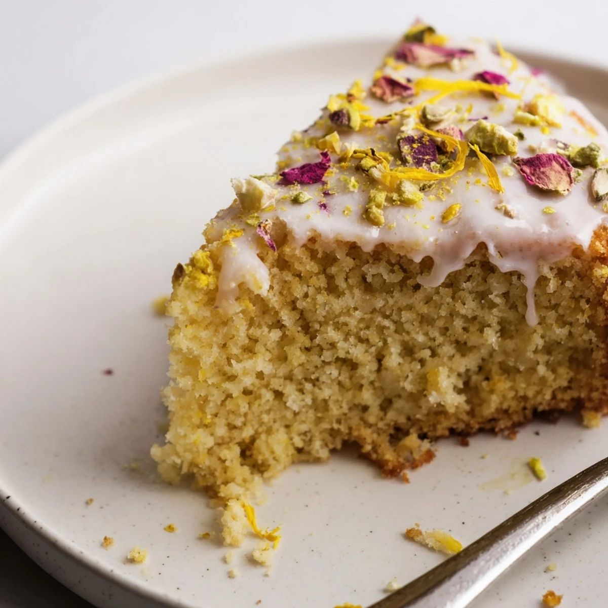 This fragrant Persian-style almond and cardamom cake blends ground almonds, flour, butter, eggs and yogurt with lemon zest and rosewater for a tender, moist crumb. Mix dry and wet components, fold gently, bake at 170°C in a 20 cm tin for about 40-45 minutes, cool, then pour a rosewater icing and scatter chopped pistachios and dried rose petals. Swap gluten-free flour or plant yogurt as needed; serves eight.